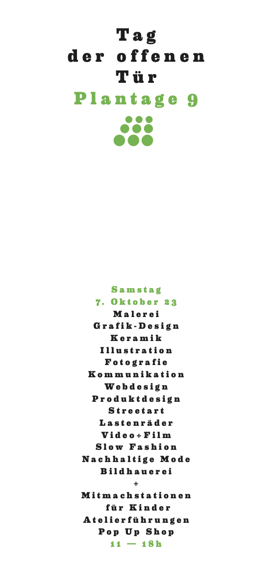 Nachdem Corona bedingt das jährliche Event ausfallen ist öffnet am 7. Oktober die Plantage 9 wieder ihre Ateliers, Studios und Werkstätten für Interessierte und alle, die einen Einblick in diese kreative Gemeinschaft am Rande Findorffs kriegen wollen. Es gibt